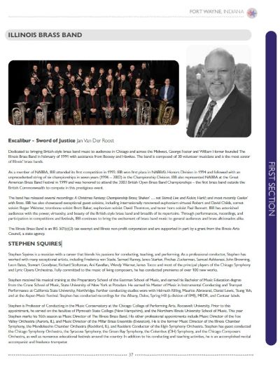 "Inspired by the fall 1990 tour of the Desford Colliery Caterpillar Band, the Illinois Brass Band was founded by George Foster and William Homer in February 1991 under the conductor of Bruce Briney. The band was formed in the tradition of the British brass band and is dedicated to bringing the finest brass band music available to Chicagoland and Midwest audiences."
