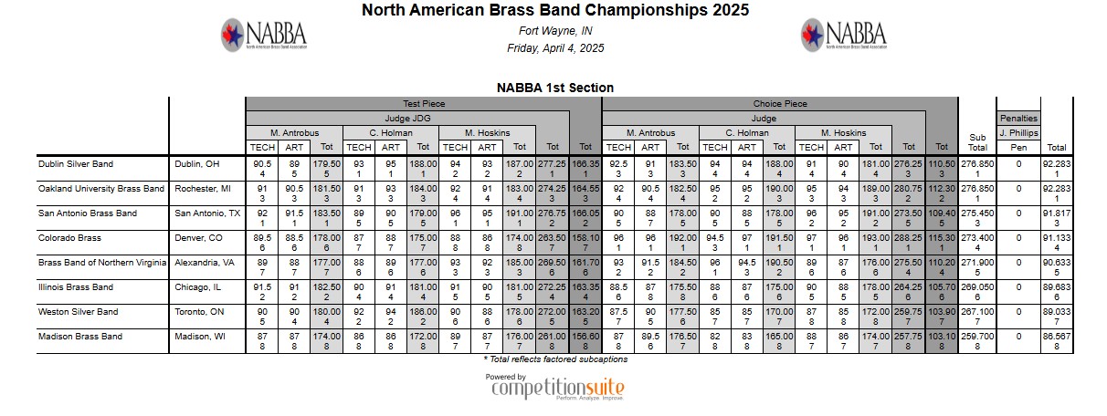 IBB finished a strong first place, with a score of 276. The next closest band was Eastern Iowa, with a score of 270. The judges were James Curnow, Bram Gregson, and Frank Renton. The band's performance and full score breakdown is below.